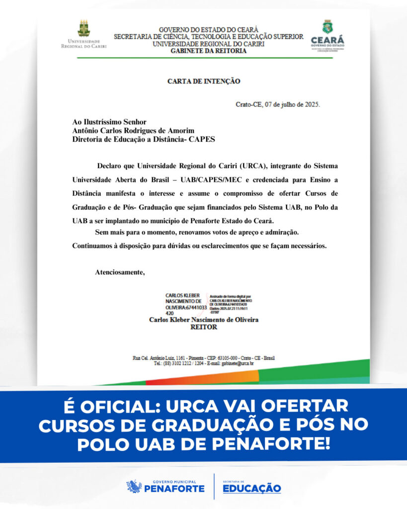 Ótima notícia para o futuro da nossa cidade: a URCA enviou a Carta de Intenção oficializando o compromisso de ofertar cursos de Graduação e Pós-Graduação no futuro Polo da UAB em Penaforte!